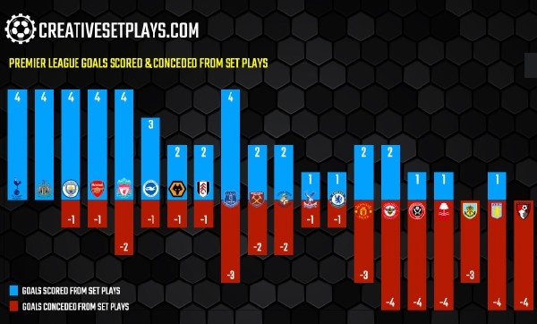 本赛季至今,热刺在定位球方面的表现很好,打入4个进球,同时没有定位球方面的丢球,是英超这方面最好的球队之一。
