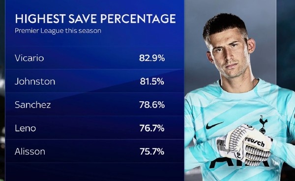 b. 维卡里奥:本赛季英超门将扑救成功率第一