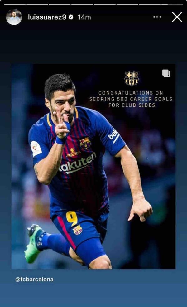 巴萨官方社媒祝贺苏亚雷斯:“恭喜达成俱乐部生涯500球里程碑。”苏亚雷斯转发了这条动态。