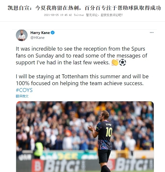 而列维不愿放凯恩走,硬是拒绝了曼城超过1亿镑的报价。最终凯恩在社媒自宣留队。