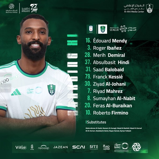 吉达国民首发:16-爱德华-门迪、3-伊巴涅斯、28-德米拉尔、37-辛迪、31-亚斯拉姆、79-凯西、30-若哈尼、7-马赫雷斯、8-纳贝特、20-布拉伊坎、10-菲尔米诺