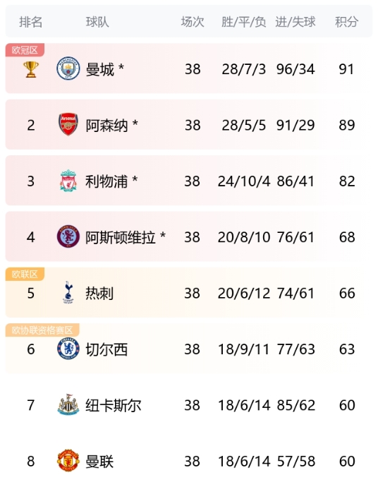 众神归位!英超传统BIG6有5队以前6名收官,仅曼联第8缺席