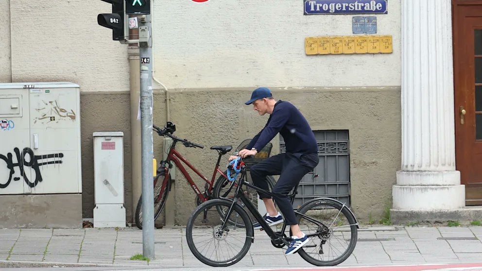 告别拜仁图赫尔参加完拜仁赛季结束聚餐,骑自行车离开