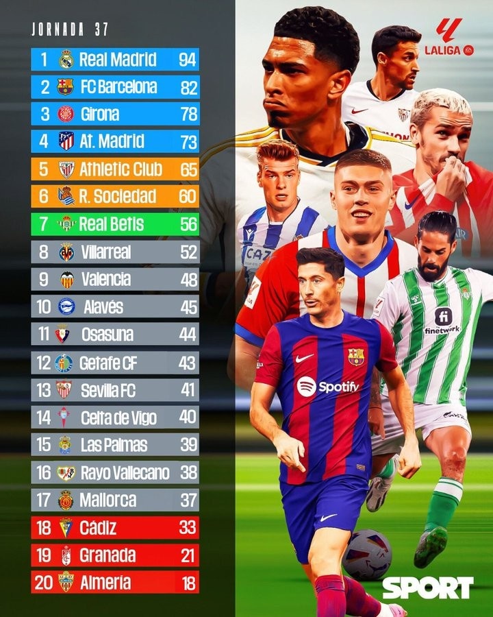 因此西甲本赛季的三支降级球队已经确定,分别是加的斯、格拉纳达和阿尔梅里亚。