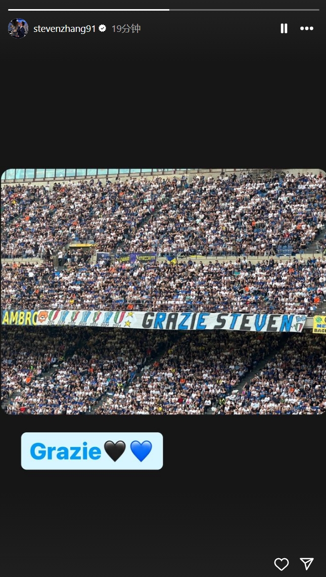 本场比赛,国米球迷在主场拉出横幅,感谢张康阳率领国米夺得队史第20座意甲冠军。国米球迷拉出的横幅中晒出了代表国米夺得意甲20冠的两颗星,并且配文:“谢谢Steven(张康阳)”。