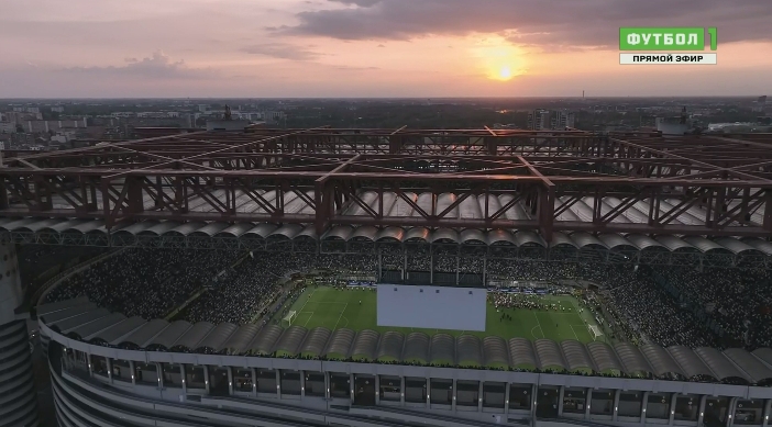 国米捧杯仪式全程队长劳塔罗捧起奖杯,球迷点亮球场
