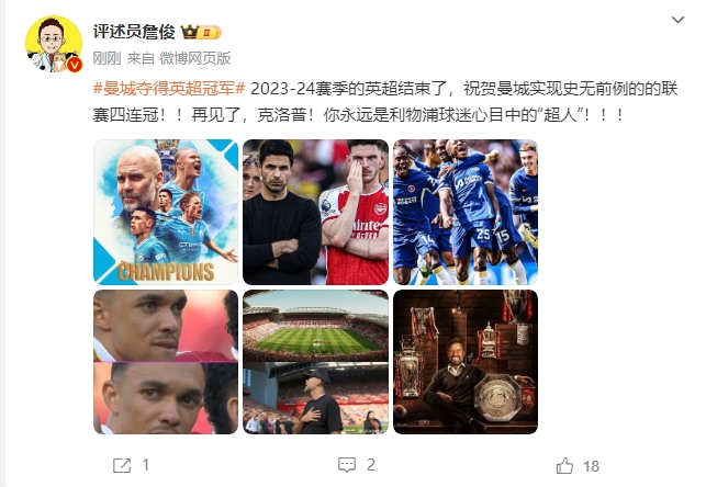 詹俊:2023-24赛季的英超结束了,祝贺曼城实现史无前例的的联赛四连冠!!再见了,克洛普!你永远是利物浦球迷心目中的“超人”!!!
