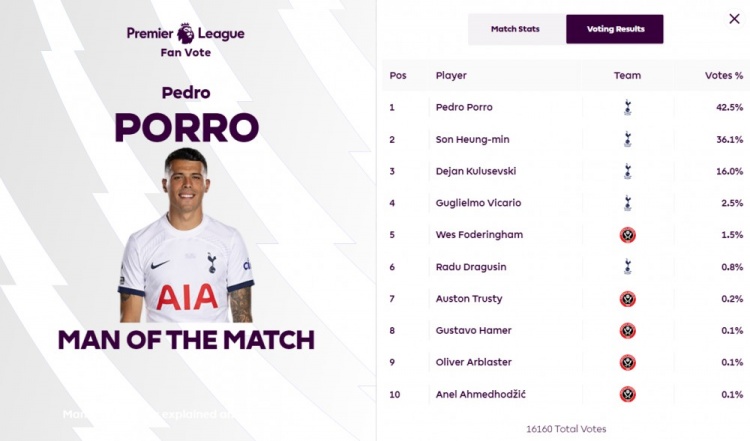 本次票选共有16160次有效投票,其中波罗获得了42.5%的投票当选全场最佳。排名二三位的孙兴慜、库卢得票率分别为36.1%和16.0%。
