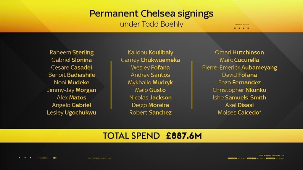 切尔西老板伯利在入主后三个转会窗签下了27名新援,总支出达到了8.876亿英镑(合10.3亿欧元)!