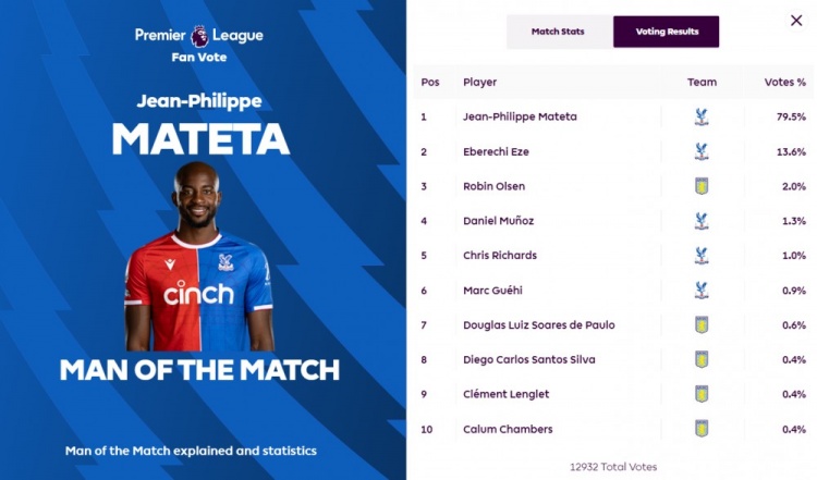 5月20日讯 英超末轮,水晶宫主场5-0横扫维拉。此役水晶宫前锋马特塔完美发挥3射1传,赛后球员也是以绝对优势当选英超官方票选的全场最佳球员。本次票选共有12
