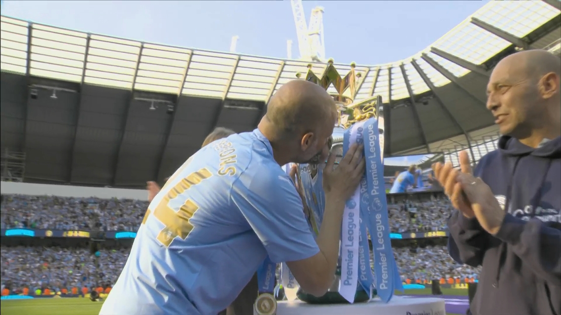 英超收官战,曼城3-1击败西汉姆联,锁定本赛季英超冠军。曼城达成史无前例的英超四连冠,近七个赛季六夺英超冠军。本帖记录颁奖仪式全程。【捧杯!】单独捧杯环节