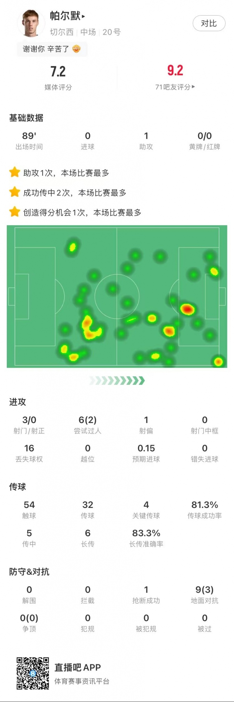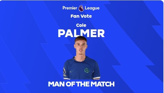 英超官方消息,助攻斯特林破门的帕尔默当选为本场比赛最佳球员。