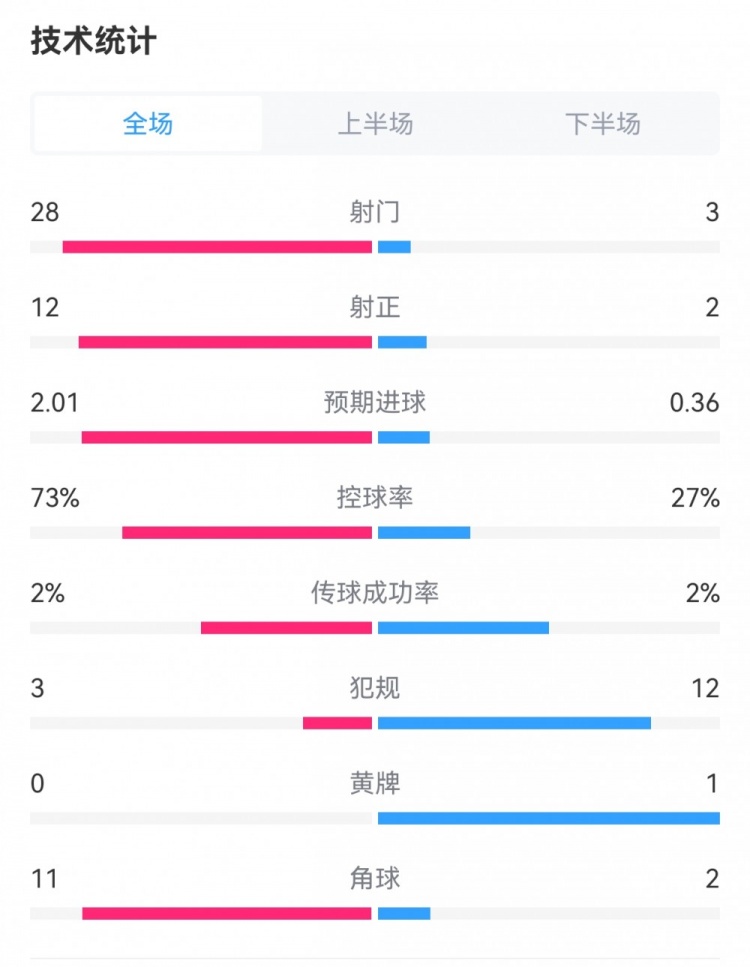 统治力!曼城3-1西汉姆:射门28-3,射正12-2,控球率73%-27%