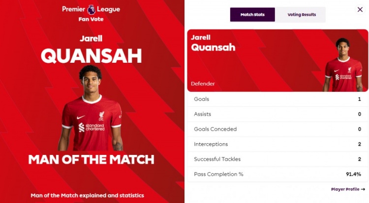 5月20日讯 英超收官战,利物浦2-0狼队,赛后宽萨47.5%得票率当选本场比赛最佳球员。