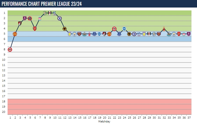 本赛季初,热刺状态火热,前10轮8胜2平,一度排在积分榜第1。但在第11轮1-4不敌切尔西之后,热刺遭遇5轮不胜,在积分镑上一路跌至第5。在之后的大部分时间也保持在了第5。