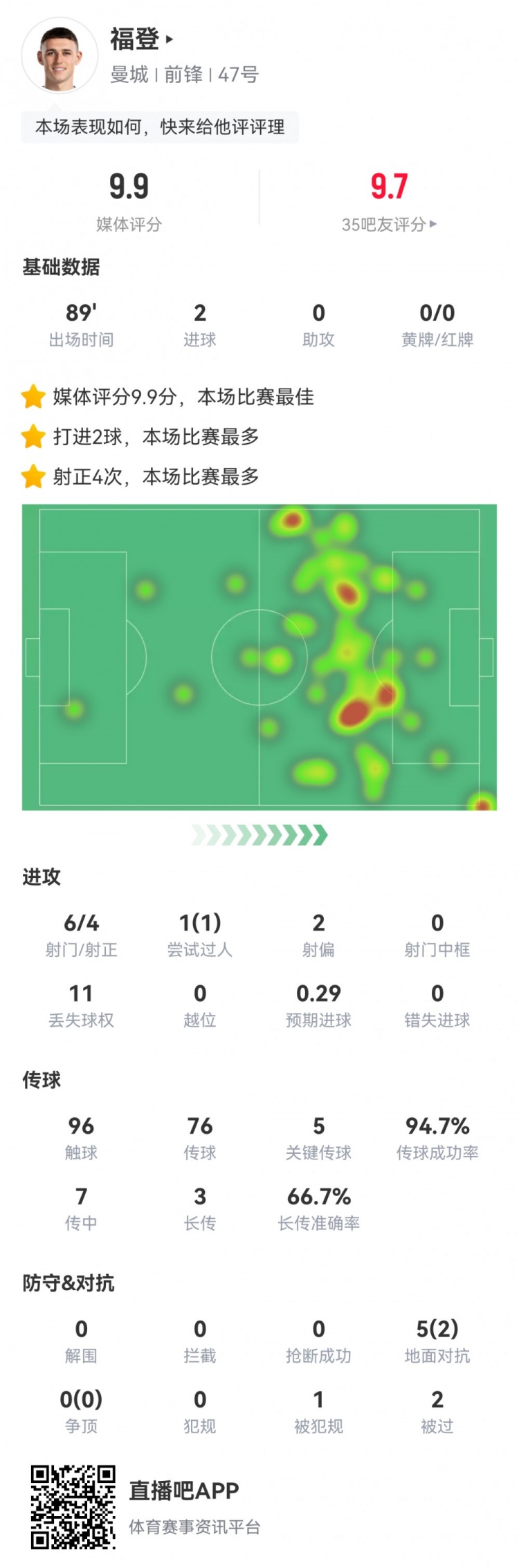 完美发挥!福登数据:6射4正2粒进球,5次关键传球,获评9.9分