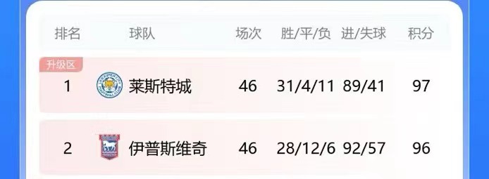 英冠升级方面,莱斯特城夺得冠军,和排名第二的伊普斯维奇获得直升英超的资格,北京时间5月26日22点,利兹联将和南安普顿进行升级附加赛决赛,决出本赛季最后一个升级英超的名额。