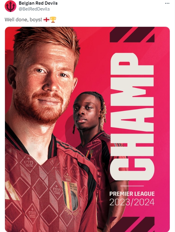 德布劳内、多库夺得英超冠军,比利时队发文祝贺