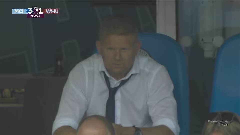 比赛第84分钟,哈兰德再一次攻门偏出后,镜头给到了看台上哈兰德的父亲老哈兰德。