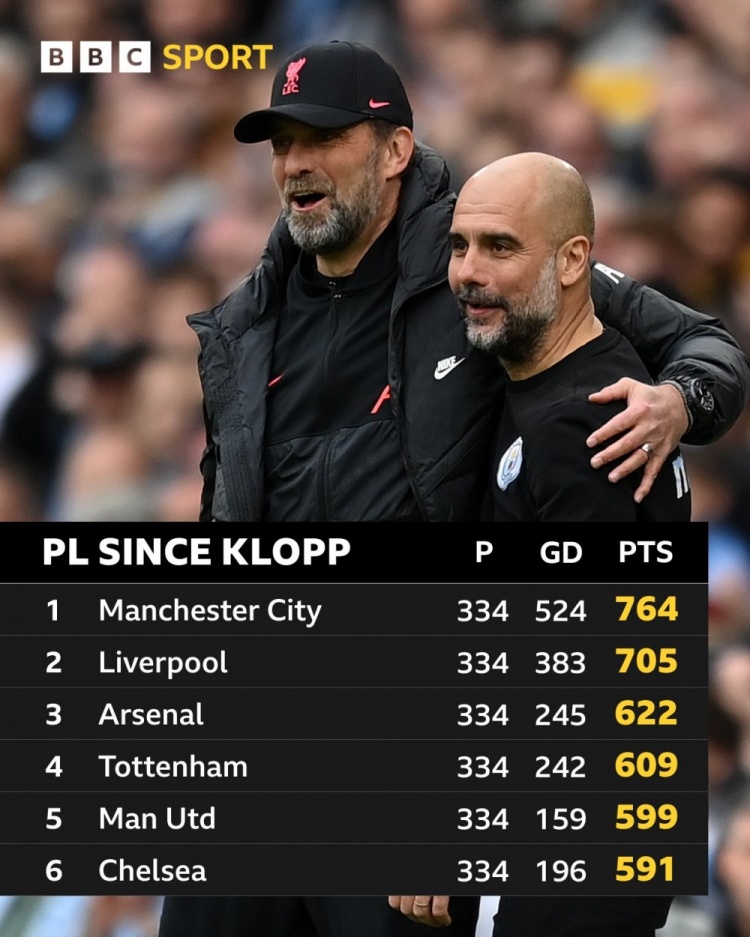 克洛普执教以来利物浦英超拿到705分,同期仅少于曼城