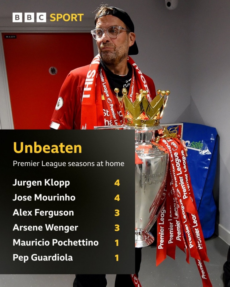 5月21日讯 利物浦主帅克洛普本赛季结束离任,据BBC统计,这位德国教头2015年接手利物浦以来,曾在4个赛季里带领球队英超主场不败,与穆里尼奥并列历史最多。