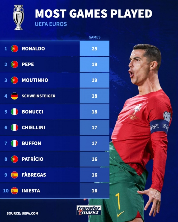 欧洲杯出场次数榜:C罗25场居首,佩佩、穆蒂尼奥19场次席