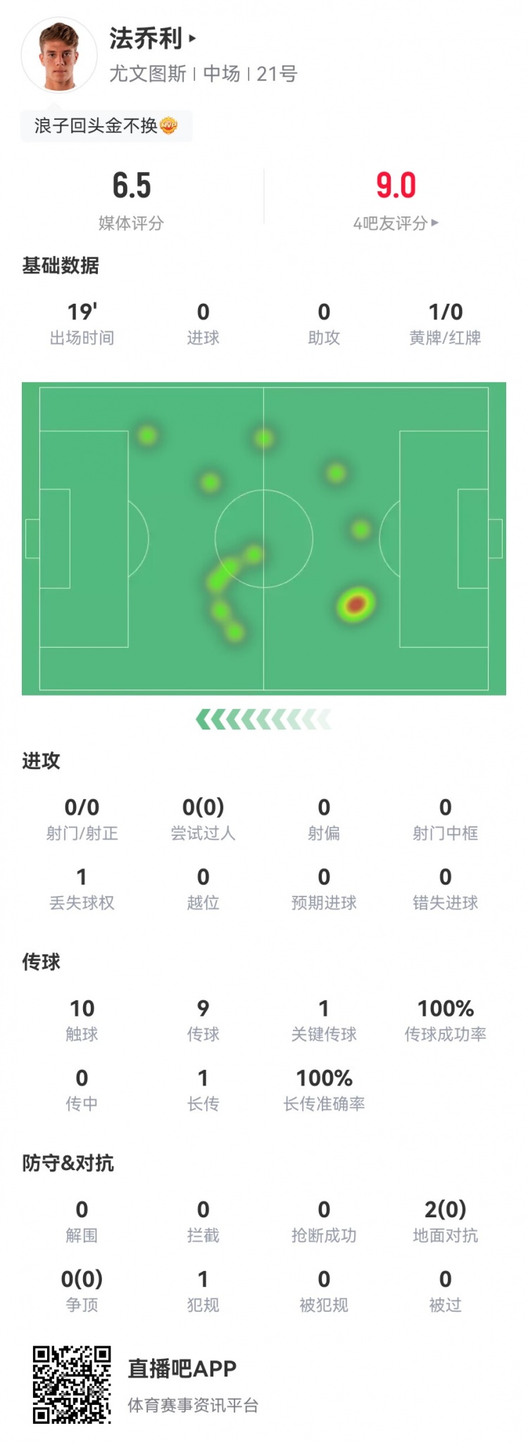 解禁复出!法乔利数据:19分钟1次关键传球 传球成功率100%
