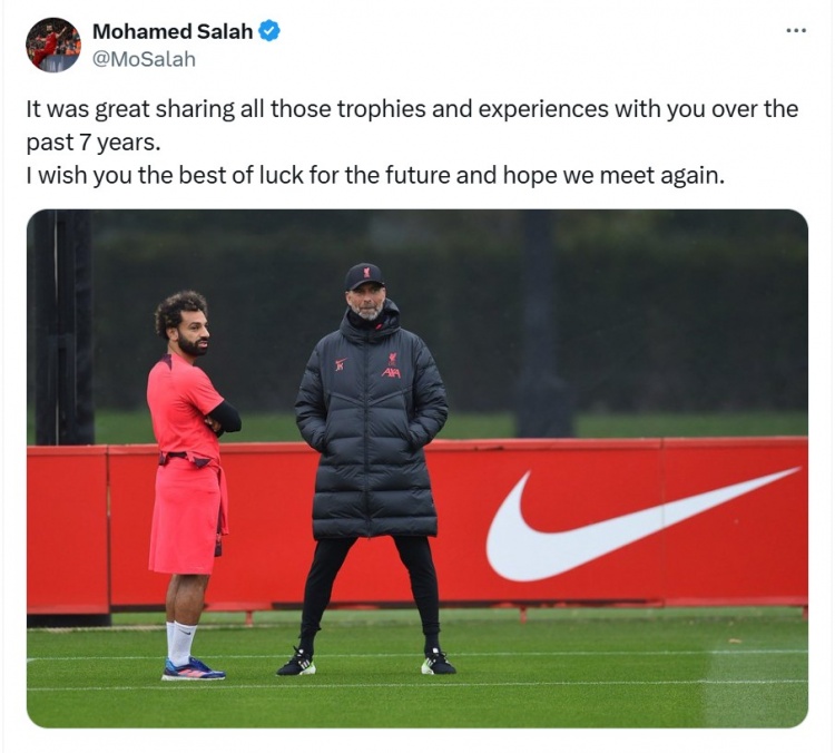 萨拉赫写道:“在过去的7年里,很高兴能与您分享所有这些奖杯和经历。祝您未来好运,希望我们能再见面。”
