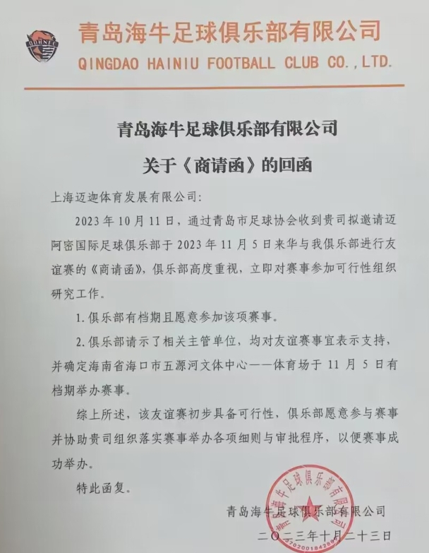 回函中,青岛海牛表示有档期且愿意参加对阵迈阿密的比赛,同时确定海南省海口市五源河文体中心体育场在11月5日有档期举办赛事。