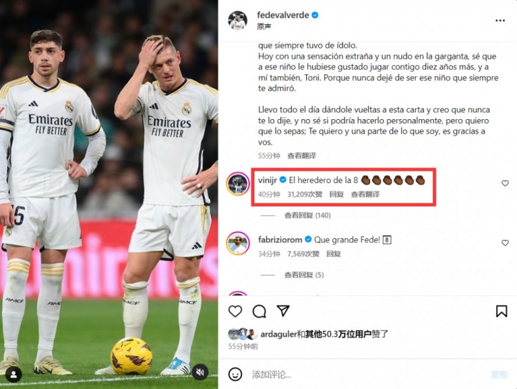 巴尔韦德深情长文告别克罗斯,维尼修斯在评论区写道:“8号球衣继承人