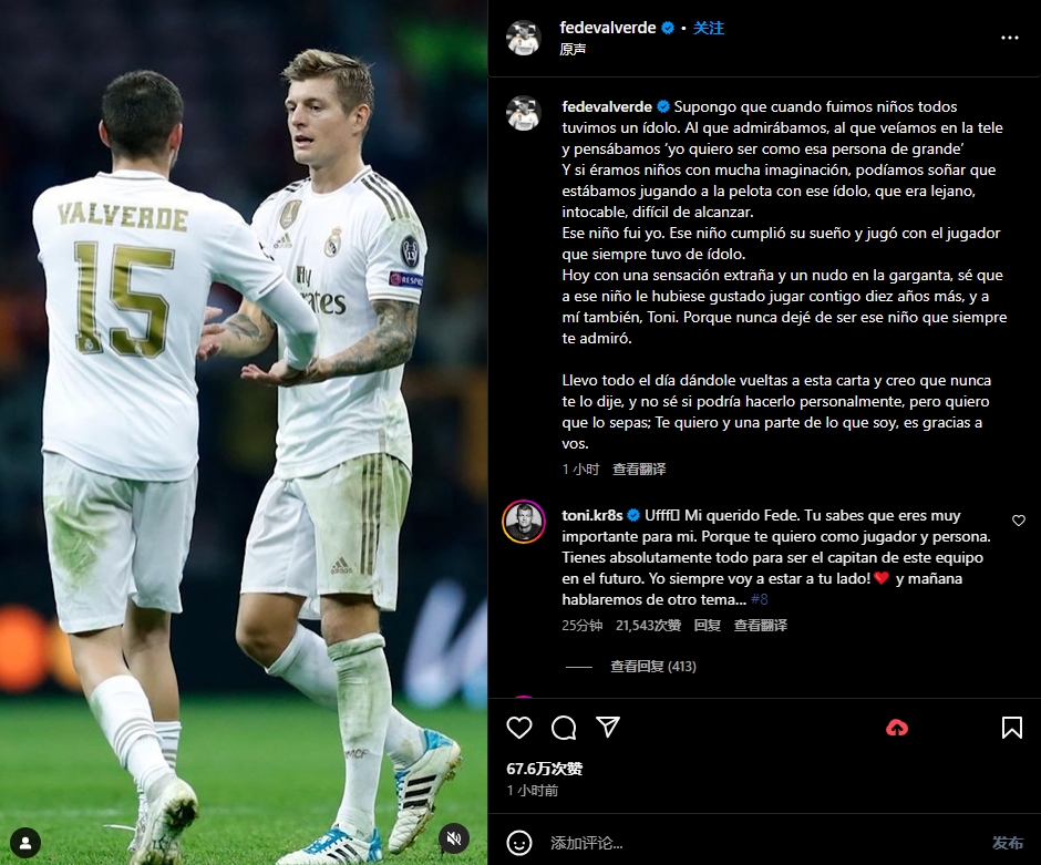 克罗斯:亲爱的费德里科,你知道你对我非常重要。作为球员还是朋友我都爱你,你绝对具有成为这支球队队长的一切条件,我永远在你身边。明天我们聊聊另一个话题,8号球衣。