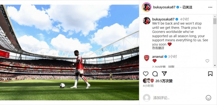 5月22日讯 本赛季英超落幕,阿森纳遗憾以亚军收官。萨卡更新社媒鼓励球队并致谢球迷。