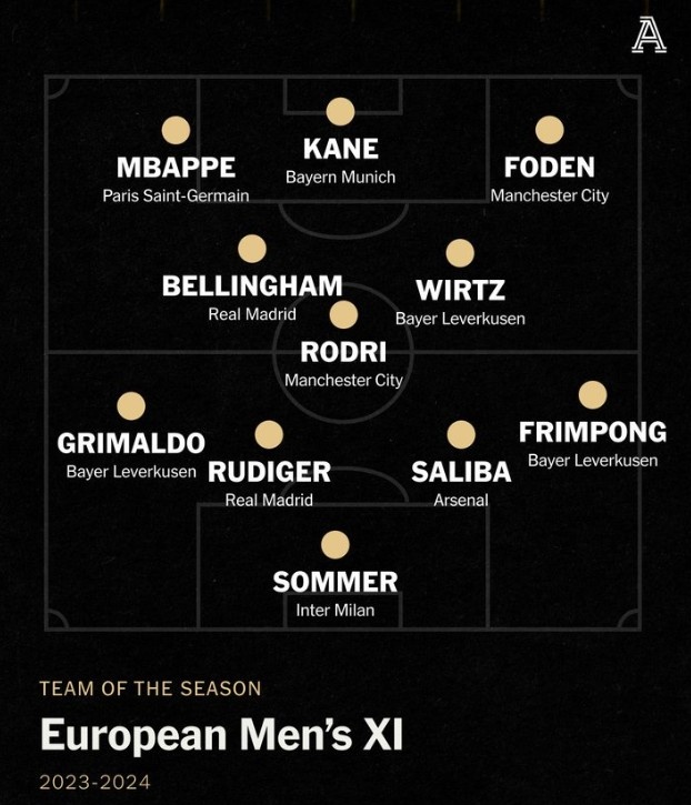 5月22日讯 2023-24赛季欧洲各大联赛即将全部落下帷幕,《The Athletic》评选出了本赛季欧洲足坛最佳阵,勒沃库森三将入选,皇马、曼城各两将在列。