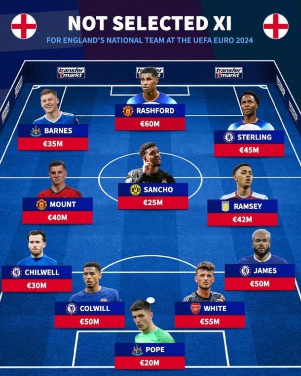 5月22日讯 英格兰队公布欧洲杯初选名单,拉什福德等人无缘,德国转会市场网列出了未入选英格兰欧洲杯名单的最佳阵容。