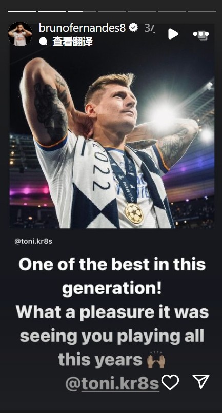 B费更新社媒致敬克罗斯,他同时写道:“这一代中的最佳球员之一,很荣幸这些年能看你踢球。”