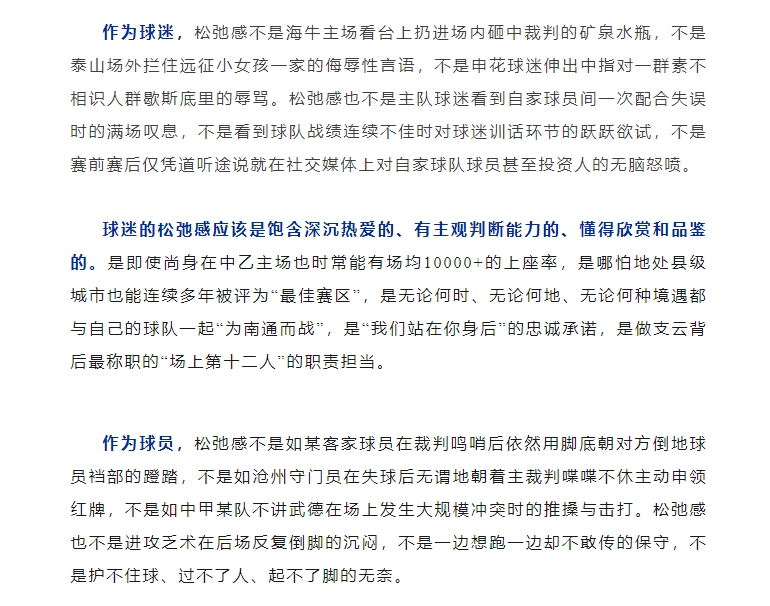 05月23日讯 南通支云官方公众号5月22日18:51分转载了一则名为《享受足球,需要多一点松弛感》的文章,内容涉及“阴阳”海牛泰山申花等多队球迷,引起热议。目前南通支云已删除这则争议推文。
