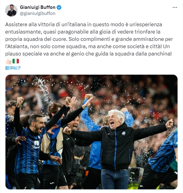 赛后,意大利名宿布冯社媒恭喜了夺冠的亚特兰大:“以这种方式见证一支意大利球队的胜利令人激动,这几乎可以与见证自己所爱球队获胜的喜悦相媲美。对于亚特兰大,我只有赞美与钦佩,不仅仅是作为一支球队,还是一家俱乐部和一座城市!特别的掌声也要送给在替补席带领球队的天才(主帅加斯佩里尼)!”