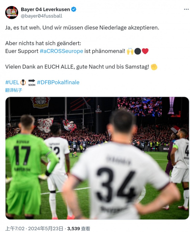 赛后勒沃库森官方社媒发文:“是的,这很痛苦,我们必须接受这场失利。”