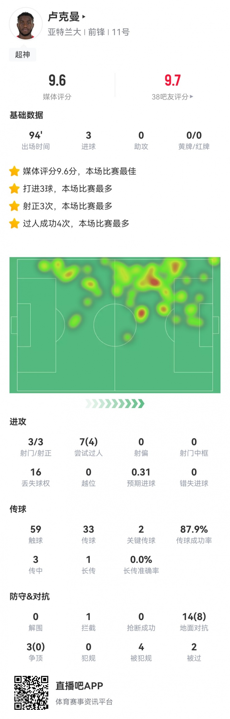数据方面,卢克曼3脚射门3次射正,打进3球!7次过人4次成功!2次关键传球,14次地面对抗8次成功。评分9.6分!