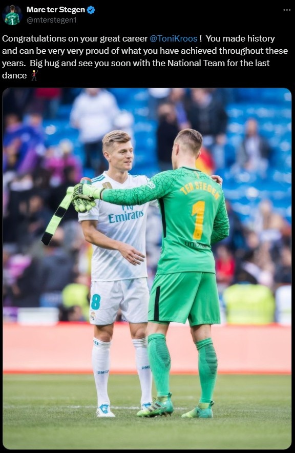 克罗斯将在欧洲杯后退役,特尔施特根写道:“恭喜你度过你伟大的职业生涯,你创造了历史,并且可以为自己这些年所取得的成就感到非常自豪。”