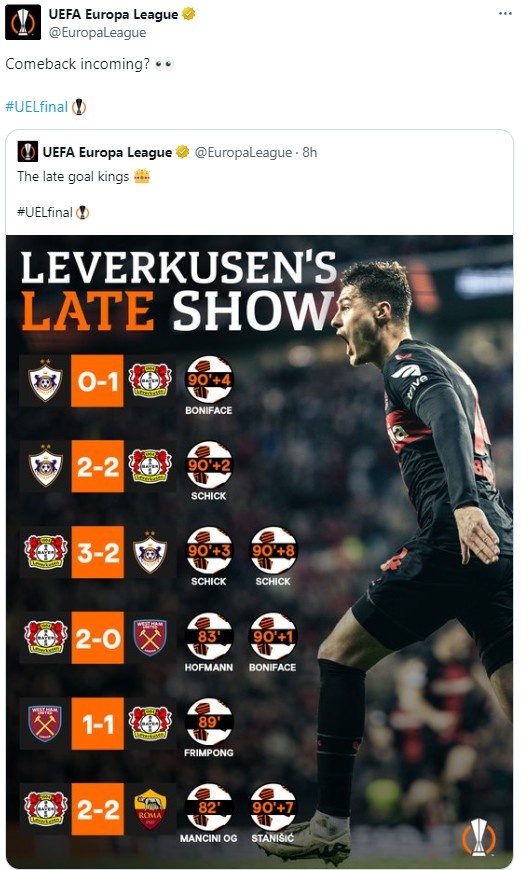 欧联杯官推转发了勒沃库森本赛季在欧联赛场上多次在比赛尾声取得进球的记录,并配文:“反击开始?