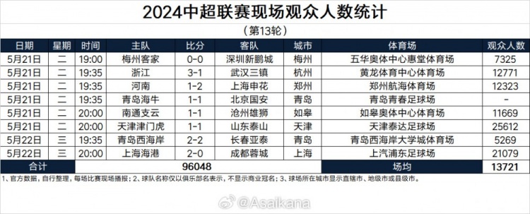 中超第13轮观众数:津门虎主场2.5万,西海岸梅州主场不到万人