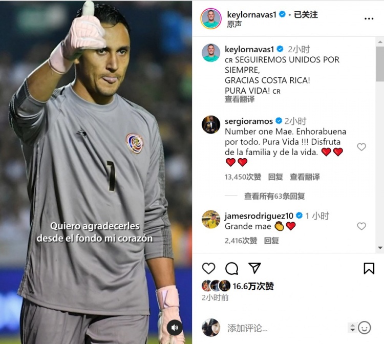 纳瓦斯在社交媒体上晒出告别视频,宣布从哥斯达黎加国家队退役,并写道:“我们将永远团结在一起,感谢哥斯达黎加!”