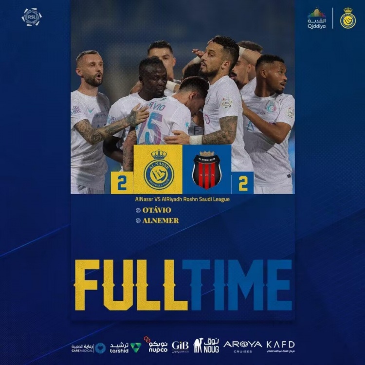沙特联第33轮,10人利雅得胜利客场2-2战平利雅得体育;C罗失单刀,拉波尔特拳击对手染红,奥塔维奥破门。