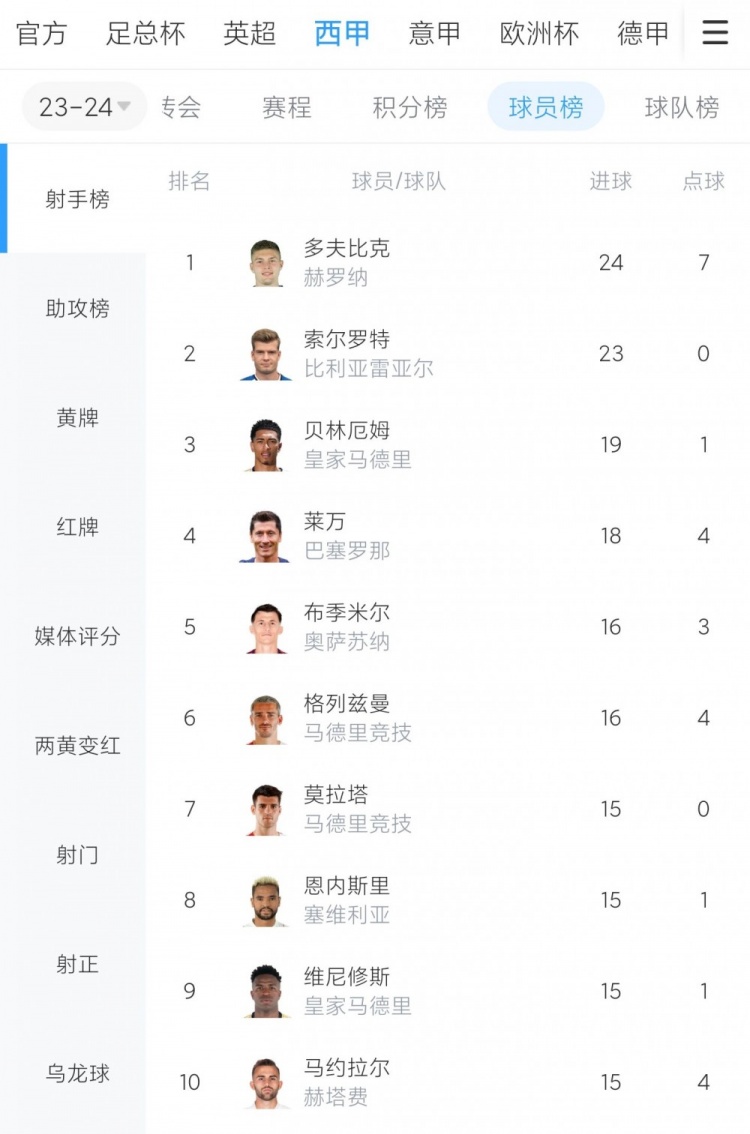 西甲射手榜: