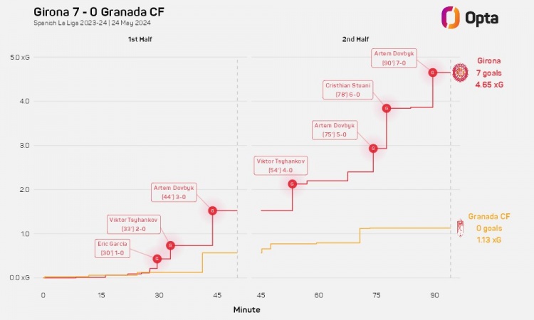 5月25日讯 在西甲第38轮比赛中,赫罗纳主场7-0大胜格拉纳达。