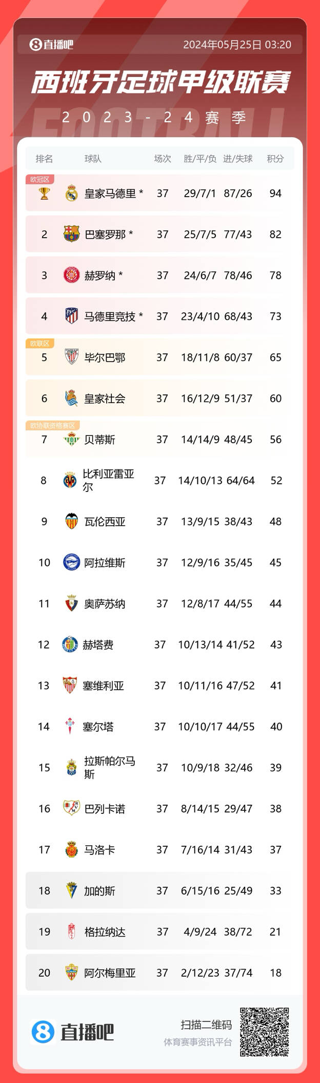 05月25日讯 《马卡报》计算了本赛季西甲各名次电视转播分成,皇马预计获得5840万欧,巴萨5150万欧,垫底的阿尔梅里亚只有90万欧。本赛季西甲各名次电视转播分成