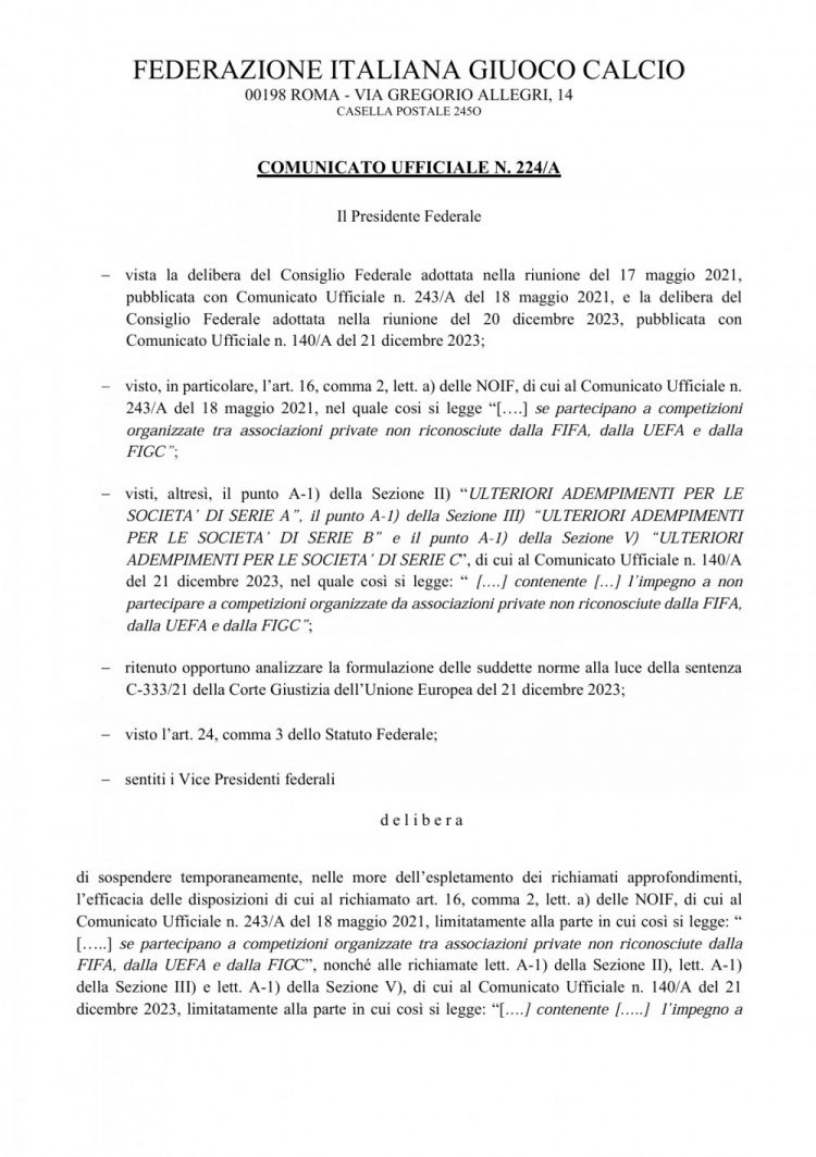 意大利足协的公告中提到了2023年12月的欧盟法院裁决,欧盟法院就国际足联和欧足联涉嫌垄断欧洲足球做出裁决,欧足联和国际足联相关规定违反欧盟反垄断法律。简单理解来说,由于欧盟法院判决欧超不需要经过FIFA批准,意大利足协21年5月的那份法案中的提到的“未经国际足联授权”已经没有意义了。