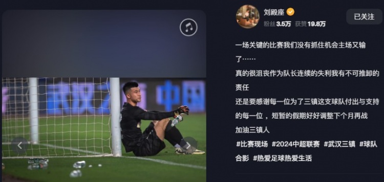 5月26日讯 中超第14轮,武汉三镇0-1梅州客家,此役,武汉三镇门将刘殿座首发出场。赛后,刘殿座在社媒发文:“一场关键的比赛我们没有抓住机会,主场又输了,真的很沮丧