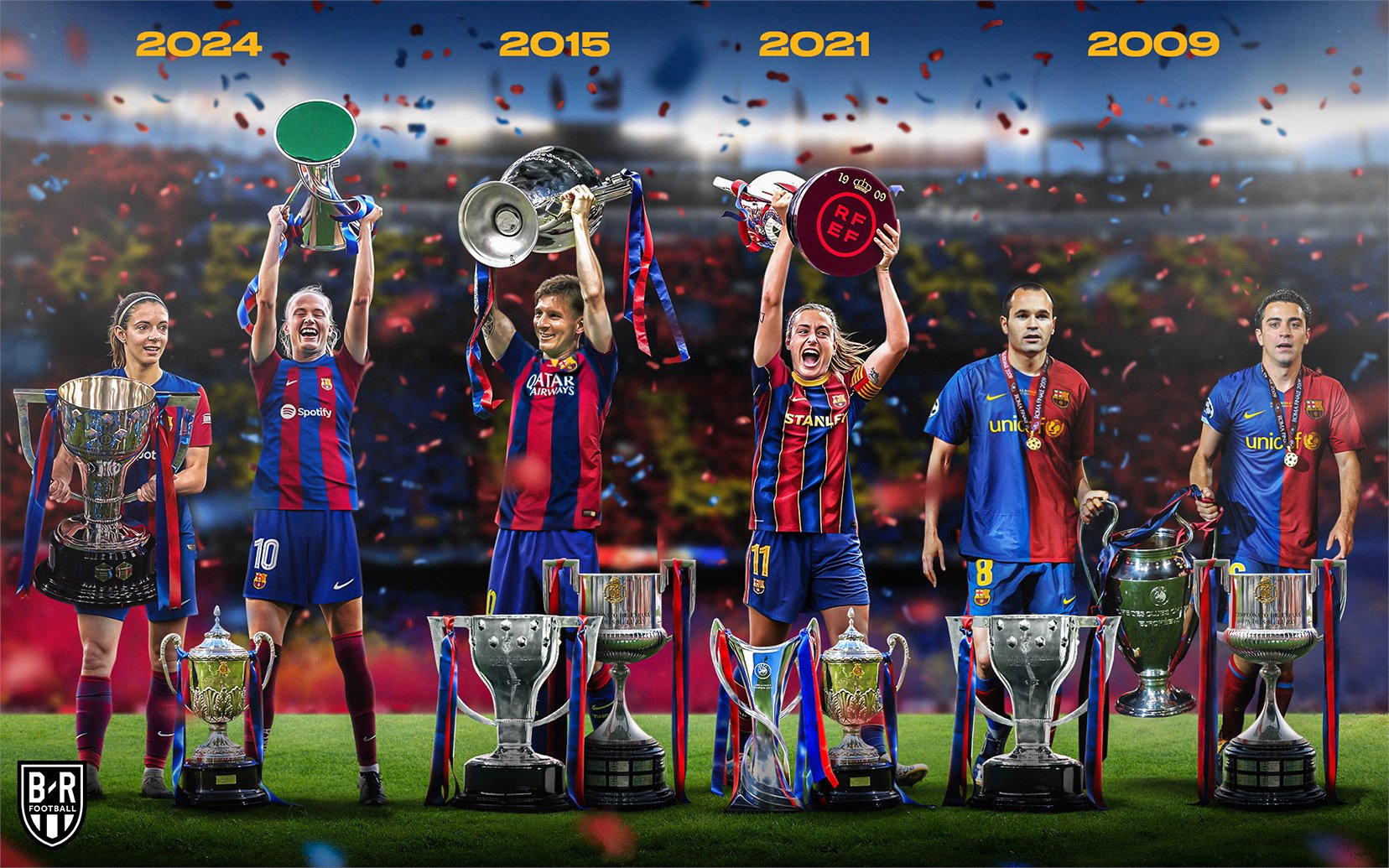 巴萨足球队已四次夺得三冠王,分别是2009年、2015年的男足和2021年、2024年的女足。